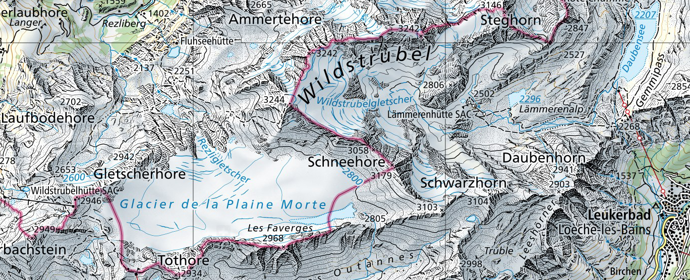 Nach Westen und Norden fällt der Wildstrubel steil ab; an der Südostflanke befindet sich der Wildstrubelgletscher, der über die Lämmerenalp zum Daubensee entwässert wird. An seiner Südflanke liegt der ausgedehnte Glacier de la Plaine Morte.