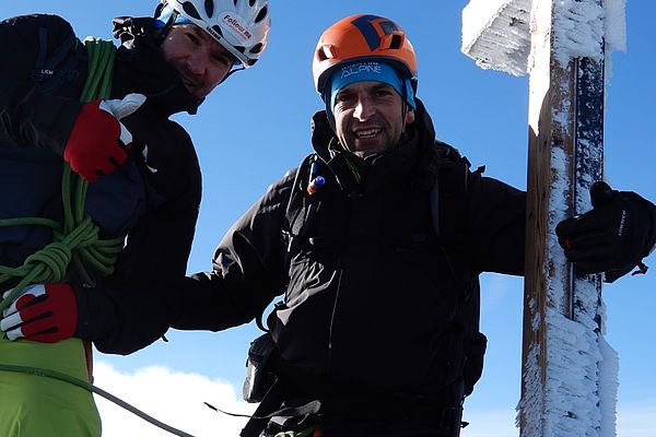 Es stellte sich als gute Idee heraus, da der Fels am Gipfelgrat vom Schnee und Graupel der Gewitter voll vereist und gefroren war. Ohne Probleme kommen wir am Gipfel an.